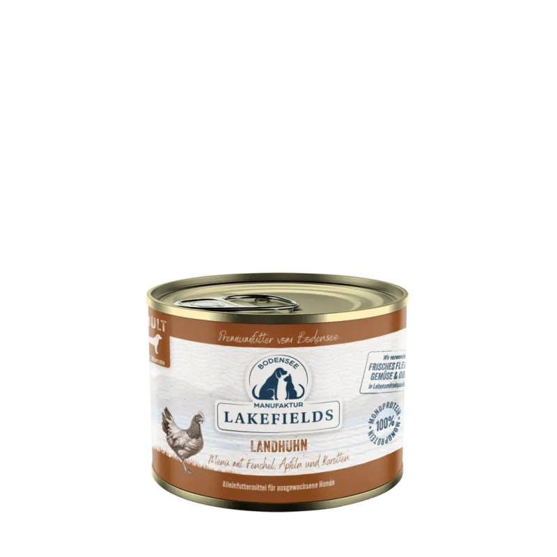 Lakefields Nassfutter-Menü Huhn Landhuhn mit Fenchel, Äpfeln und Kartoffeln. Für ausgewachsene Hunde